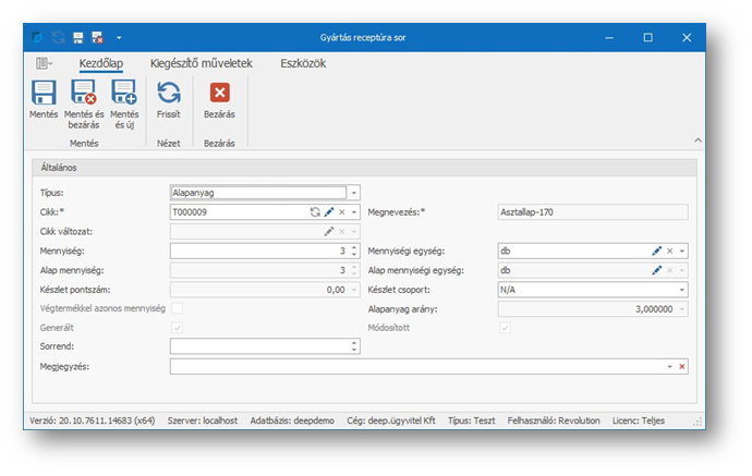 | Generált: | Ha a sor automatikusan jött létre a receptúra alapján, akkor be van pipálva a mező. Nem módosítható. |