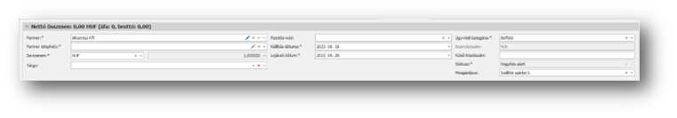 Ezen a területen találhatók a tranzakció fejléc adatait tartalmazó mezők. A sáv összezárható/lenyitható aszerint, hogy a terület adatait szeretnénk-e látni. A sáv nevében is szerepel a nettó összesen és a devizanem, így összezárt állapotban is informatív.