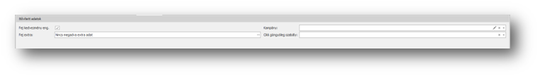 | Fej extra: | A mező melletti …-ra kattintva extra adatokat vehetünk fel, mely a bizonylat egészére vonatkozik. A megjelenő ablakban a Szöveges extra lapfülön 10 darab szöveges adatot, míg az Egyéb extrák lapfülön Szám, Dátum és Logikai típusú adatokból rögzíthetünk 10-10-et. A Szöveges extra mezőkbe a Bizonylati megjegyzés funkcióba felvett megjegyzésekből (fej, sor) is választhatunk. |