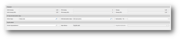 | Kampány: | Kiválaszthatjuk a mezőben, hogy a sorok felvitelénél mely kereskedelmi kampány alapján ajánlódjanak az árak és kedvezmények. |