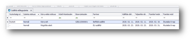 Szállítóinktól kapott előlegszámlák rögzítésre szolgáló funkció. Olyan esetekben kapunk előlegszámlát, amikor a szállítónk az áruszállítás teljesítése előtt szeretne részben, vagy egészben pénzügyi teljesítést kapni tőlünk.