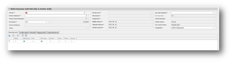 Ezen a területen találhatók a tranzakció fejléc adatait tartalmazó mezők. A sáv összezárható/lenyitható aszerint, hogy a terület adatait szeretnénk-e látni. A sáv nevében is szerepel a nettó összesen és a devizanem, így összezárt állapotban is informatív.