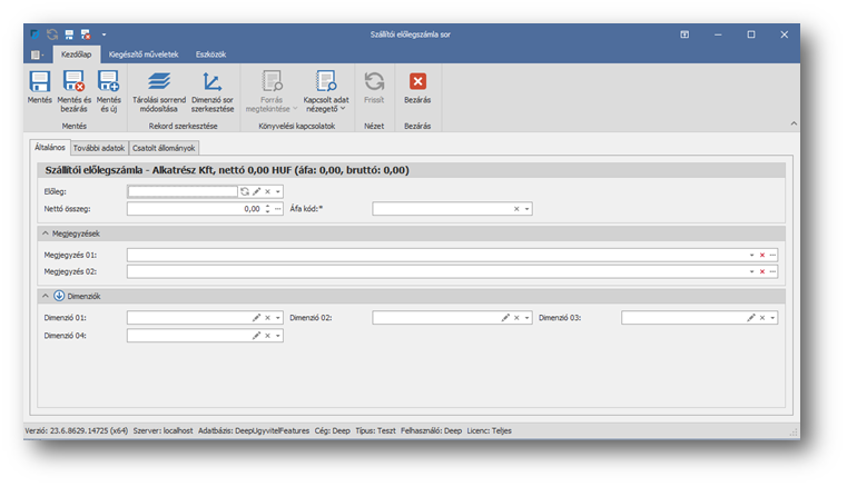 | Dimenziók: | Beállítástól függően megjelenő dimenzió rögzítési lehetőség, ahol az adott sorhoz tartozó dimenzió értékeket kell rögzíteni. |