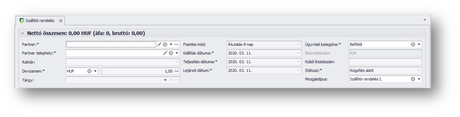 | Teljesítés dátuma: | Erre a dátumra kérjük a szállítást. Kezdőértéke a mai nap, de módosítható a mező értéke. Az itt megadott értéket kapják meg kezdőértékül a tranzakció sorok. |