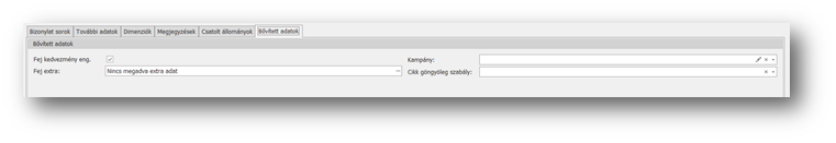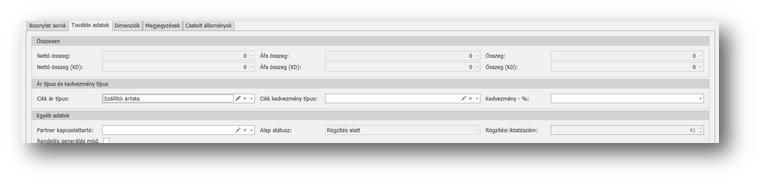 | Kampány: | Kiválaszthatjuk a mezőben, hogy a sorok felvitelénél mely kereskedelmi kampány alapján ajánlódjanak az árak és kedvezmények. |
