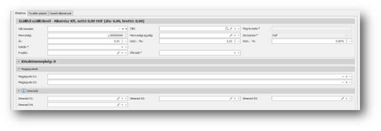 | Dimenziók: | Beállítástól függően megjelenő dimenzió rögzítési lehetőség, ahol az adott sorhoz tartozó dimenzió értékeket kell rögzíteni. |