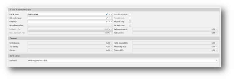| Ár típus és kedvezmény típus terület: | Ezen a területen kiválaszthatjuk a cikkhez tartozó ár és kedvezmény listákat. |