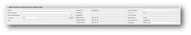 Ezen a területen találhatók a tranzakció fejléc adatait tartalmazó mezők. A sáv összezárható/lenyitható aszerint, hogy a terület adatait szeretnénk-e látni. A sáv nevében is szerepel a nettó összesen és a devizanem, így összezárt állapotban is informatív.