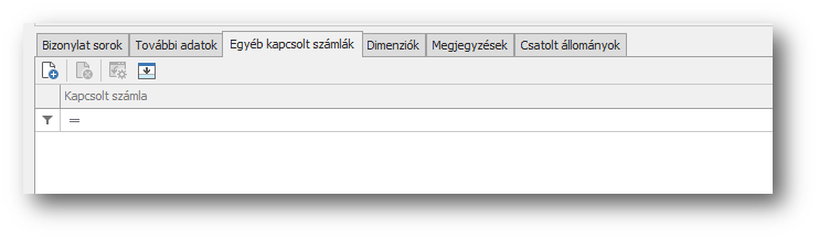 Az egyéb kapcsolt számlák lapfülön M-es lapok töltéséhez lehet számlákat összekapcsolni. Szállítói számla és pénzügyi számla funkcióban a megegyező partnerre felvett szállítói számlák közül lehet választani.