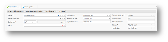 - Vevői ajánlat fej adatainak kitöltése -