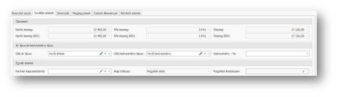 | Kampány: | Kiválaszthatjuk a mezőben, hogy a sorok felvitelénél mely kereskedelmi kampány alapján ajánlódjanak az árak és kedvezmények. |