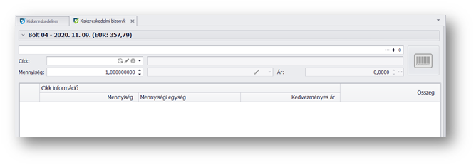 Az áttekintő felület a bizonylatok fej és sor adatait jeleníti meg. Sajátos működéséből adódóan a kiskereskedelmi bizonylatoknál nem található meg a Mentés és bezár funkció. A rögzítés alatt levő bizonylatok vagy mentés nélkül zárhatók be, vagy a Mentés funkció használatával azonnal véglegesen rögzítésre kerülnek. Mint a többi kereskedelmi bizonylat, szigorú számadású, vagyis nem törölhető, könyvelés után nem módosítható.