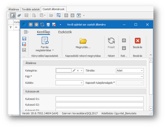 Az egyes tételekhez (sorokhoz) fájlokat is csatolhatunk a csatolt állományok lapfülön. Ennek működése hasonló, mint a teljes bizonylathoz történő fájlcsatolás: Csatolt állományok lapfül.