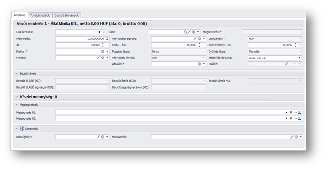 | Teljesítés dátuma: | Erre a dátumra kérjük a sorbeli tételt, ekkorra rendeljük meg. Kezdőértéke a fejlécben megadott teljesítési dátum, de módosítható a mező értéke. |