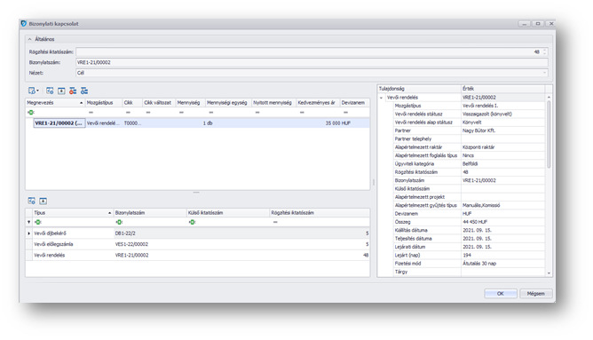 A kereskedelmi bizonylati kapcsolat bővítve lett a díjbekérő és előlegszámla esetén az alsó részen egy listával, amely megjeleníti, hogy az adott láncunkban milyen bizonylatok szerepelnek.