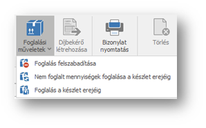 Foglalás műveletek: Foglalás felszabadítása / Nem foglalt mennyiségek foglalása a készlet erejéig / Foglalás a készlet erejéig, választással feloldható a foglalás, vagy lefoglalhatók a rendelés tételei. (Mennyiség forrása = "Raktár" esetén lehet a műveletekkel foglalni. "Szállítói rendelés", "Gyártás" esetben csak felszabadítani lehet.) A folyamat részletes leírása a Készlet foglalás fejezetben található.