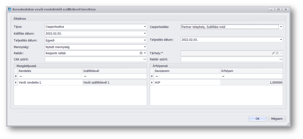 Raktár: A létrejövő rendelést melyik rakátrhoz rendeljük hozzá. Amennyiben a mozgástípusban nincs beállítva alapértlezett raktár, és kötelező a foglalás, akkor csak a mezők kitöltve tudunk továbblépni.