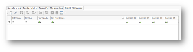Az egyes tételekhez (sorokhoz) fájlokat is csatolhatunk a csatolt állományok lapfülön. Ennek működése hasonló, mint a teljes bizonylathoz történő fájlcsatolás: Csatolt állományok lapfül.
