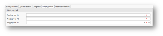 | Megjegyzés 01...03: | A sorhoz fűzött egyes számú megjegyzés. Szabad szövegesen is beírhatunk megjegyzést, de a … gombra kattintva választhatunk a Bizonylati megjegyzés funkcióban előre rögzített (sor)megjegyzések közül is. A kiválasztott előre definiált megjegyzés a kézzel már megadott megjegyzéshez kerül hozzáfűzésre. A mező melletti legördítő nyilacskára kattintva megtekinthetjük az összefűzött megjegyzést. A bizonylatra is kinyomtatásra kerül. A Megjegyzések lapfül, sormegjegyzések fejezetben tájékozódhatunk a további lehetőségekről. |