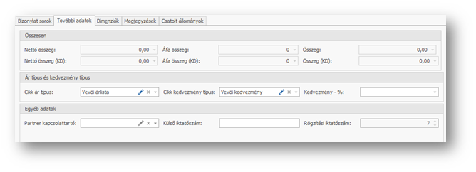 | Kampány: | Kiválaszthatjuk a mezőben, hogy a sorok felvitelénél mely kereskedelmi kampány alapján ajánlódjanak az árak és kedvezmények. |