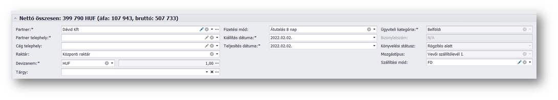 A nettó összesen területen találhatók a tranzakció fejléc adatait tartalmazó mezők. A sáv összezárható/lenyitható aszerint, hogy a terület adatait szeretnénk-e látni. A sáv nevében is szerepel a nettó összesen és a devizanem, így összezárt állapotban is informatív.