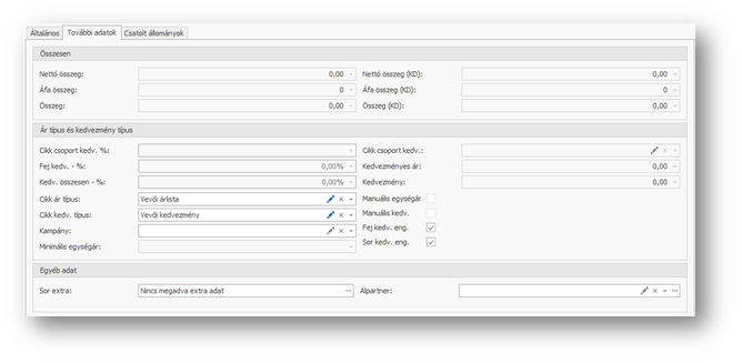 | Kampány: | Kiválaszthatjuk a mezőben, hogy a sorban mely kereskedelmi kampány alapján ajánlódjanak az árak és kedvezmények. A fejlécben kiválasztott kereskedelmi kampány szolgál kezdőértékül a mezőnek. |