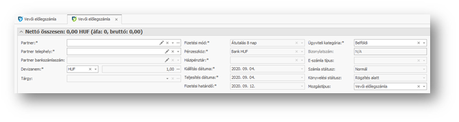 - Vevői előlegszámla fej adtok rögzítési felülete -