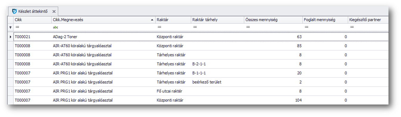 A készlet áttekintő "Raktár\Raktári tárhely\Cikk\Cikk változat" csoportosításban jeleníti meg a készletet. Azokban az esetekben ahol van raktári tárhely vagy cikk változat, egy cikkhez több sor is tartozhat. A tárhelyes raktárak esetében egy külön összesítő sorban is láthatjuk a cikkenkénti készletet. A sorokban megjelenő adatok szűrhetők, csoportosíthatók, különböző fájl formátumba kiexportálhatók. (Listás áttekintők)