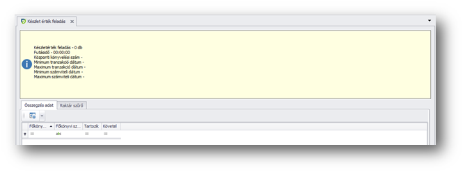 A "Készlet érték feladása" művelettel (toolbar-on található) indítjuk el a számítást, amelynek a lefutása után a jobb oldali területen összesítést láthatunk (az "Összegzés adat" lapfülön) az elvégzett generálásokról. Futtatás után aktívvá válik a "Könyvelt tételek" művelet, amelyet elindítva megjelenik egy "Főkönyv részlet" ablak, ahol a jelen feladás nyomán történt főkönyvi könyveléseket tudjuk tételesen megnézni.
