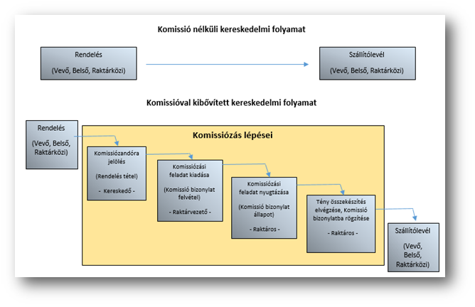 A komissiózás nélküli folyamatban a rendelés (vevő, belső, raktárközi) bizonylatot a szállítólevél bizonylat felvétele követi, míg a komissiózás használatakor közéjük iktatunk egy komissiózás bizonylatot (és ezzel egy komissiózási folyamatot) is.