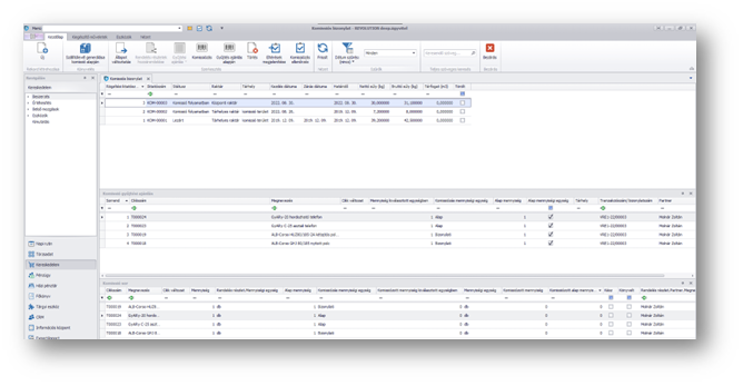 A funkcióban két fő tevékenység végezhető el a komissióhoz kapcsolódóan. Egyrészt a rendelés tételeket (vevő, belső, raktárközi - Gyűjtés típus a rendelés tételen Komissió beállítással rendelkezik) egyben áttekintő felület (táblázat), amelyből a komissiózási feladatot (összekészítési feladatot) kiadó személy elvégezheti a nyitott mennyiséggel rendelkező rendelés tételek komissiózáshoz rendelését. A hozzárendelést segíti a táblázat jobb oldalán megjelenő tájékoztató ablak, ami a kijelölt táblázatsor (rendeléssor) adatait tartalmazza. A megjelenő szállítólevél tételsorok irrelevánsak a komissiózás szempontjából. Két művelet kapcsolódik a menüsoron a komissiózáshoz: