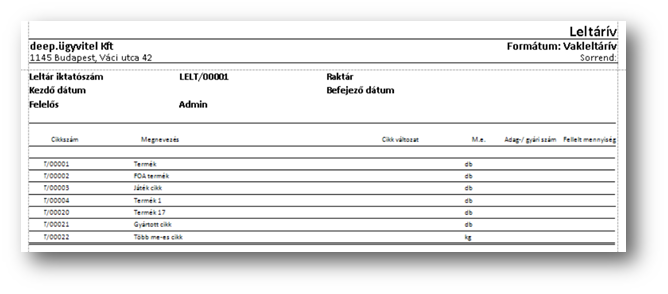 | Nyomtatás / Vakleltárív művelet: | Segítségével a Leltárív funkcióban felvett sorok nyomtathatók ki úgy, hogy tárhelyenként csoportosítva a fellelendő cikkek látszanak, de a megtalálandó mennyiségek nem jelennek meg a listán. |