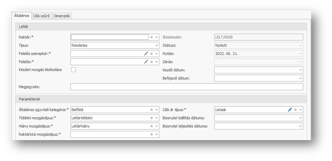 | Nyitás: | Leltár felvételének dátuma, amely automatikusan töltődik. |
