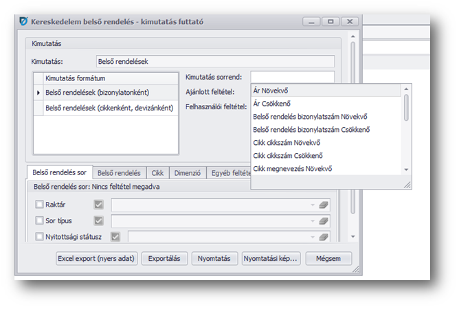 | Kimutatás sorrend: | A mezőbe történő szöveg begépelésekor, vagy a mezőn nyomott F4 gomb hatására megjelennek a választható sorrendek, amely közül a kiválasztott sorrend szerint fognak lejönni a kimutatásban az adatok. Kimutatásfüggő, hogy milyen sorrendek közül választhatunk. |