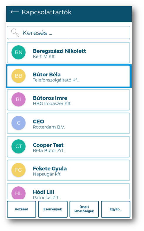 A funkció elindításakor megjelennek a minden partner összes kapcsolattartója. A kiválasztott kártyára duplán rányomva jelenik meg az adatmódosítási lehetőség. Beállítható a megjelenő találatok laponkénti mennyisége, a táblázat rendezettsége, valamint további beállítások, amelyeket az Áttekintő beállíátsok bekezdésben tudunk megnézni.
