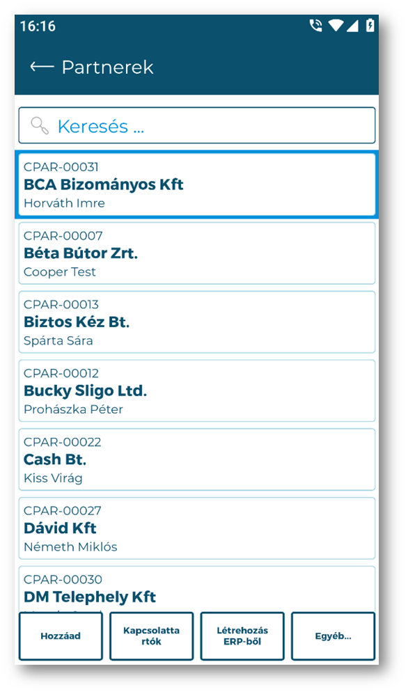Megnyomásával az adott Partnerhez rögzíthetünk kapcsolattartót.