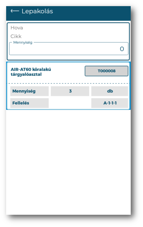 A felület csak akkor érhető el, ha a cél raktár tárhelyes. A felületen vonalkód beolvasással lehet kiválasztani a cél tárhelyet, majd cikk vonalkód beolvasással rögzítésre kerülnek a sorok. Amennyiben adunk meg mennyiséget a cikk vonalkód beolvasása előtt, akkor ezzel a mennyiséggel keres rögzítendő tételt. Ha nincs kitöltve a mennyiség, akkor a mennyiség 1 ME lesz. Maga a funkció az első sikeres találattal dolgozik. Tehát ha pl.: felpakoltunk 3 X 10 mennyiségben egy cikkből három különböző tárhelyről és lepakolunk 12-őt egy adott tárhelyre, akkor nincs lehetőségünk megadni, hogy mely 10-es tétel melyik forrás tárhelyről vegyük, illetve a maradék 2-őt melyik forrás tárhelyről. Ezt a listában megjelenő tételekből tudjuk meg utólagosan. Rögzítés folyamán a listában bontásra kerülnek a tételek. Az előző példából kiindulva a 3x10-es sorból lesz 1x10-es, ahová bekerül a cél tárhely, lesz 1x10-es, ami érintetlen és lesz még kettő egy 2-es beírt cél tárhellyel és egy 8-as üres cél tárhellyel. A lepakolást addig kell végezni, míg minden sorban látható lesz a cél tárhely. Ezután lehet menteni a bizonylatot.