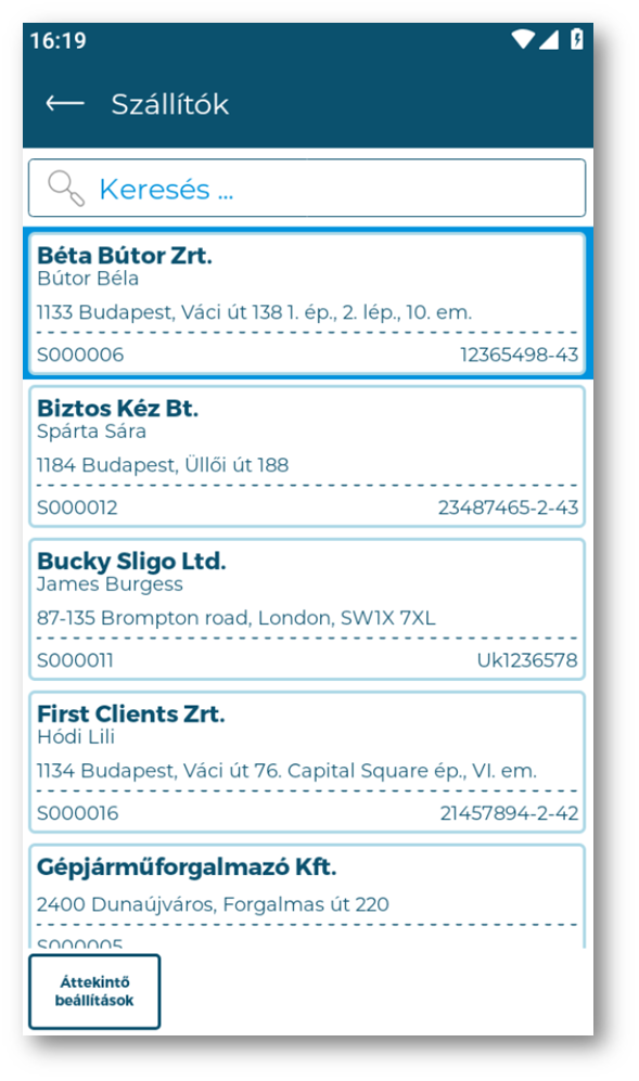 A funkció elindításakor megjelennek a mobil eszközön használható szállítók, amelyeket kézzel szűrhetünk. A kiválasztott szállító egyes adatai (neve, számlázási címe) szerkeszthetők. Azok a szállítók jelennek meg, amelyek aktívak. (Aktív = "True") A kiválasztott sorra duplán rányomva jelenik meg az adatmódosítási lehetőség. A táblázat fejlécét nyomva tartva változtatható, hogy mely oszlopok jelenjenek meg a lent felsoroltak közül. Beállítható a megjelenő találatok laponkénti mennyisége, a táblázat rendezettsége, valamit további beállítások, amelyeket a Áttekintő beállítások bekezdésben tudunk megnézni. . A listás áttekintő jobb szélén a kívánt kártyán balra húzva a mezőt megjelenik egy "Kimutatás" gomb, amelyre rányomva az elinduló "Kimutatás formátum" ablakban kiválasztható, hogy mely deep-es kimutatást szeretnénk a választott partner szűréssel kinyomtatni pdf formátumba.