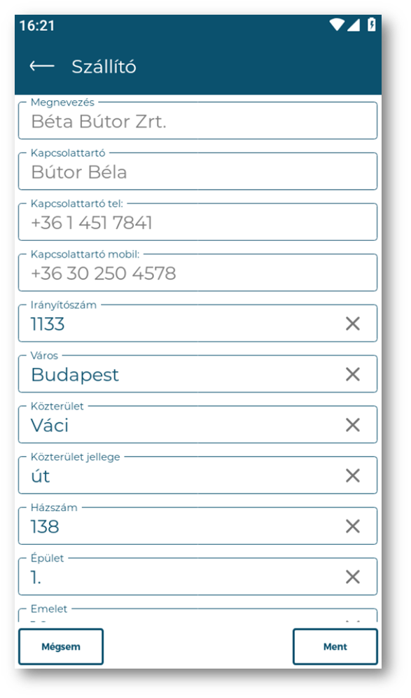 | Épület: | A partner számlázási címének épülete. Módosítható. Mentéskor visszaíródik a Szállító funkcióba a Számlázási cím Épület mezőjébe. |