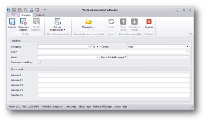 | Tárolás: | Adat/Elérés választással meghatározhatjuk, hogy csak a fájl elérési útját (linkjét) fogjuk letárolni, vagy a konkrét fájlt is letároljuk a deep adatbázisában. |