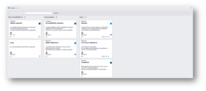 A feladathoz hozzászólás rögzíthető. A hozzászólások időrendben csökkenő sorrendben jelennek meg. Alapértelmezetten tartalmazzák a hozzászólás szövegét, dátumát és a rögzítő nevét. Az oszlopválasztóval további információk tehetők ki az ablakra.