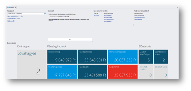 A programban összeállítható egy kezdő munkafelület, ami egyrészt informatívan tájékoztat a fő folyamataink állásáról, másrészt tartalmazza a szokásosan használt adatbeviteleinket, kedvenc kimutatásainkat. A Kezdőlap funkció tartalmazza ezt az informatív, vizuálisan is aktívan tájékoztató, munkakezdő felületet. A Csempe műszerfal és Kedvenc művelet funkcióban, illetve a kimutatásokban lehet definiálni a felület kinézetét, majd a felhasználókhoz kell rendelni a számukra összeállítottat.