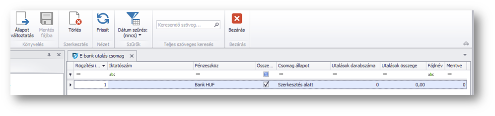 Az elkészült csomag "Szerkesztés alatt" státusszal megjelenik az áttekintő felületen. Ahhoz, hogy a banki felületre beolvasható fájlt elkészítsük, a menü sorban található Állapot változtatás ikonra kell nyomi, és az elkészült fájlt egy általunk választott helyre lementeni. A csomag állapota "Elküldött"-re fog változni, az áttekintőn pedig megjeleníthető a hozzá tartozó fájl megnevezése, mely már betölthető a banki felületre.