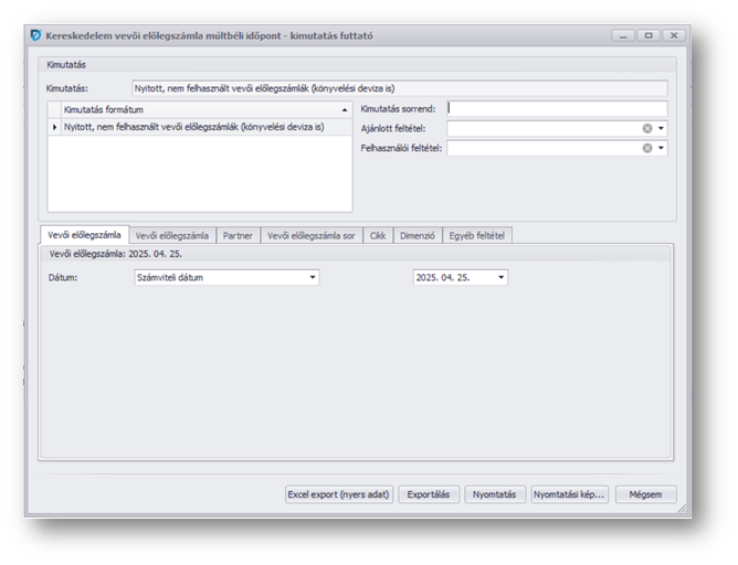 | Kimutatás formátum: | Nyitott, nem felhasznált vevői előlegszámlák (könyvelési deviza is) |