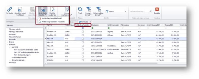 Adott bizonylato(ko)n állva akár tömegesen is lehet változtatni, hogy azokat a kintlévőségkezelésből kizártra, esetlegesen a későbbiekben kintlévőségkezelésbe visszatett státuszban szeretnénk-e kezelni.