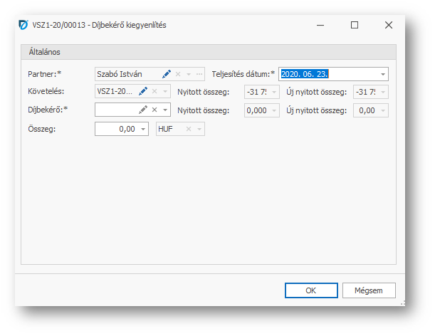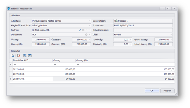 A fizetési részleteknél az új gombra történő rákattintással tudunk új fizetési határidőt felvenni, értéknap és összeg megadással. A rendszer számszaki vizsgálatot végez az újként felvitt fizetési részletek és a bizonylat végösszeg egyezősége tekintetében.