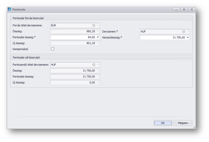 Összepontozható két különböző devizanemű tétel is, ez esetben a kézi pontozást kell választani. Ebben az esetben a Forrás tétel pontozási összegéhez kell rögzíteni, amit ki szeretnénk egyenlíteni a Keresztösszeghez pedig a pontozási cél bizonylatról azt az összeg kell megadni, amit elszámolni szeretnénk.
