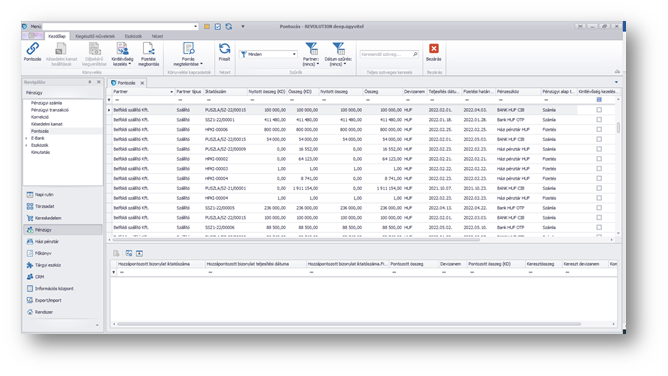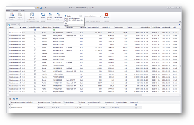 Az áttekintőn a könyvelt folyószámlás követelések és kötelezettségek jelennek meg, melyeket a nyitottsági státuszra valamint saját és könyvelési devizanem szerint szűrve jeleníthetünk meg.