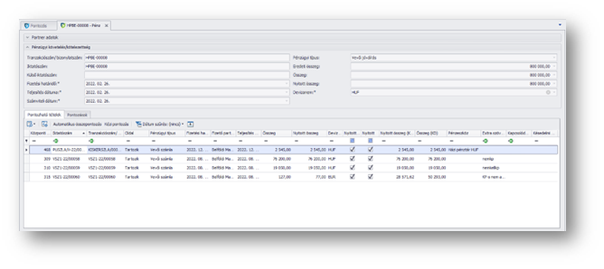 A pontozás funkcióval megjelenik a pontozó ablak, amely felső részében a kiválasztott bizonylat alapadatai jelennek meg, az alsó részben pedig azok a bizonylatok, melyekkel összepontozható.