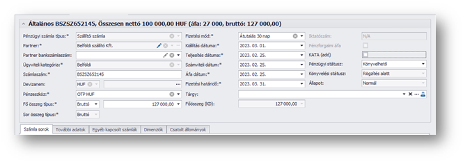 | Devizanem: | A rögzítendő számla devizaneme. Az értéke a Partner adatokból öröklődik, ha ott ki van töltve. |